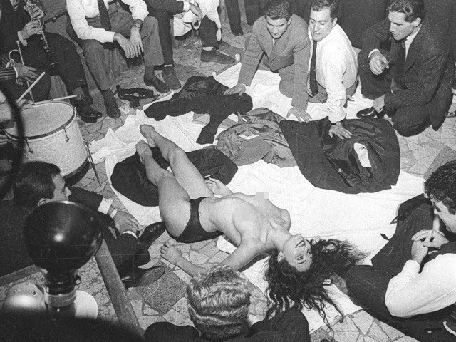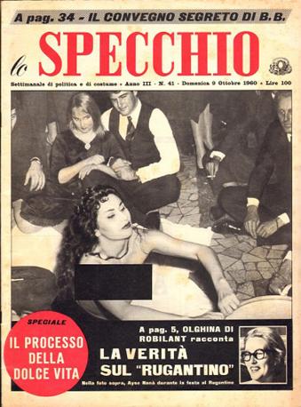 Secchiaroli immortala lei che ride, si piega sulle gambe, scioglie i capelli nerissimi guardata con sussiego da aristocratiche signore in nero e fili di perle, mentre impazza la Roman New Orleans Jazz Band di Carletto Loffredo. Inevitabilmente arriva la polizia con una spettacolare irruzione. Secchiaroli è sveltissimo. Non si fa perquisire e mette in salvo il rullino che va in prima pagina su «L’Espresso» (ai tempi nel mega formato a lenzuolo). Scandalo clamoroso, anche internazionale.