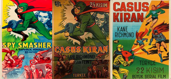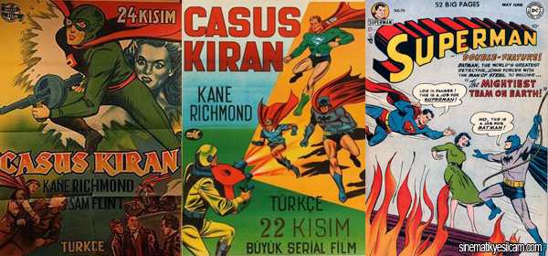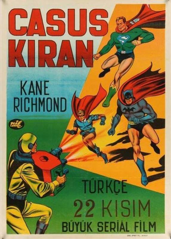 “Nil Film” logosunu taşıyan ve Emel Ofset baskısı bu afişin gerek Türkçe başlığı, gerekse afişte yeralan oyuncu adı (Kane Richmond), Spy Smasher (tam çevirisi: “Casus Ezici”) adlı 1942 tarihli seriyal filmin afişi olduğunu ortaya koyuyor. Ancak aslında Spy Smasher’da ne Superman, ne de Batman ve Robin yeralmaz. O halde filmin bu Türkçe afişinde bu iki süper kahramanın ilüstrasyonlarının yeralması nasıl açıklanabilir?