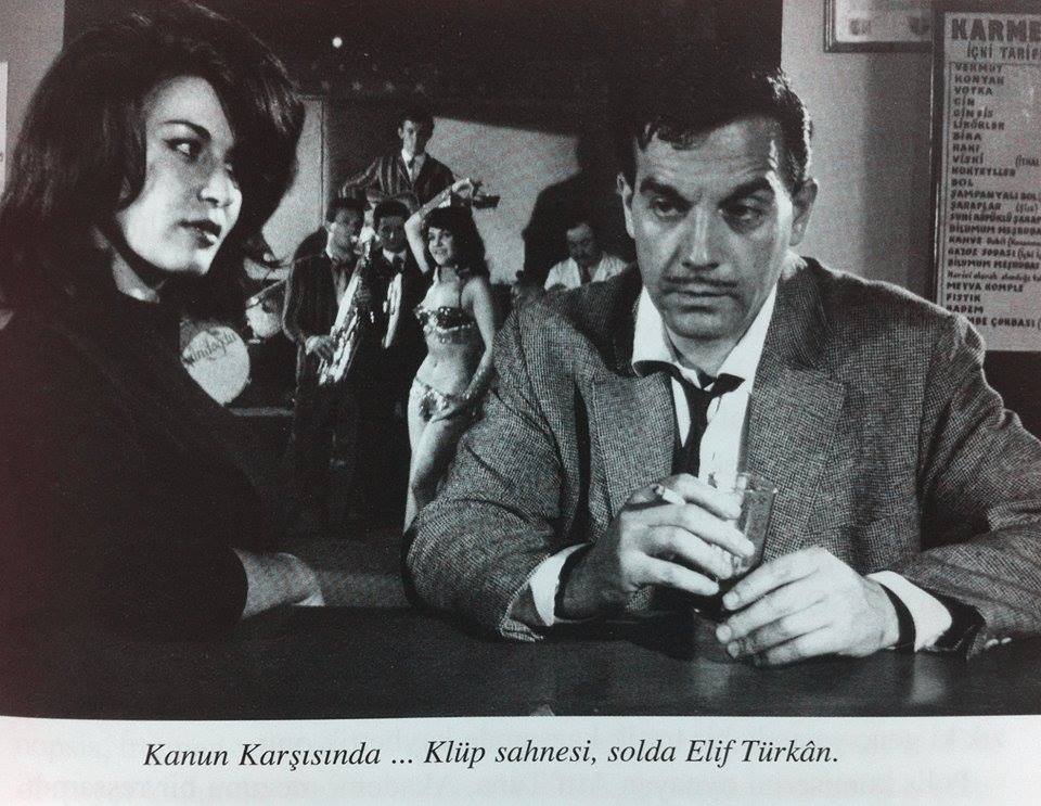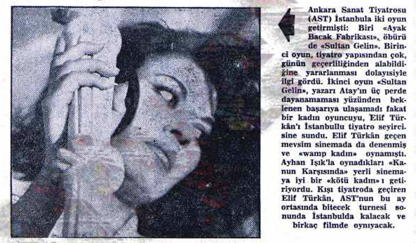Elif Türkan’ın canlandırdığı Leyla karakteri, tavırları, konuşması ama en çokta ses tonu ile filme damga vuruyor. Elbette bunun bir altyapısı var. Elif Türkan Ankara Devlet tiyatrolarının bir oyuncusu 1960‘larda (aşağıdaki küpürden detayları okuyabilirsiniz). Eski tiyatro dergilerinde kendisi hakkında bir hayli (o yılların moda sözü ile) tavsilat var. Kanun Karşısında (1964) ne yazık ki ilk ve son filmi.