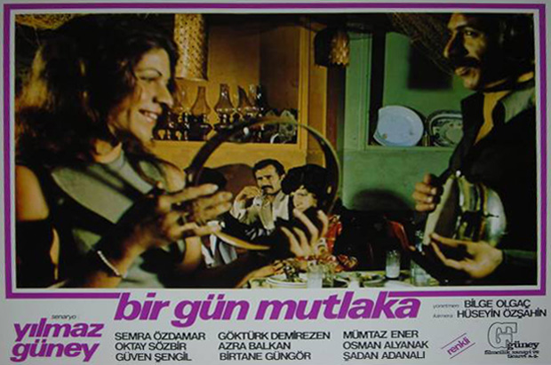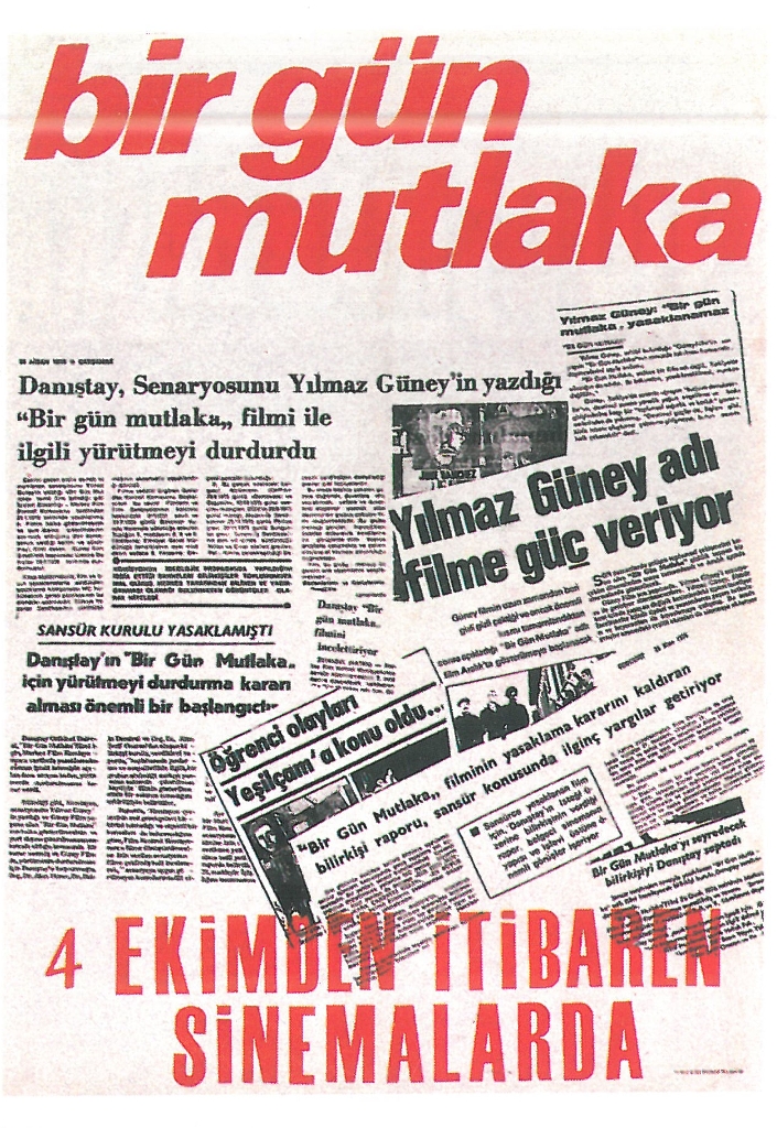Yılmaz Güney‘in senaryosunu yazdığı ve Güney Film’in çektiği “Bir Gün MutlakaTürkiye sinemasının içinde bulunduğu koşullara, egemen sınıfların baskılarına karşı halka dönük, halka bir şeyler verebilme çabasını sürdürmeye çalışan, üzerinde zorlukların, baskıların yoğunlaştığı bir olaydır. Film yer yer kopyalarının kaçırıldığı, yakıldığı, gösterildiği sinemaların bombalandığı, seyircisine baskı yapıldığı bir dizi olay içerisinde sinemalarda gösterilmiştir.