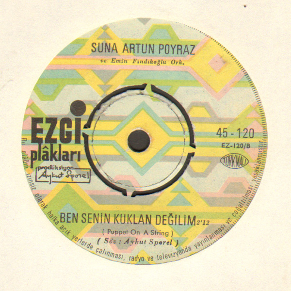 Ben Senin Kuklan Değilim‘Puppet on a String‘i Suna Artun Poyraz, Aykut Sporel‘in Türkçe sözleri ile ve Emin Fındıkoğlu Orkestrası eşliğinde plak yapmıştı. ‘Ben Senin Kuklan Değilim‘ (Nisan, 1968); “Aman çok dikkat et, dikkat et kırma//Seviyorsan sen de beni nazik ol bana//Ben senin kuklan değilim////Eğer sevilmek istiyorsan sen de sevmelisin//Yok eğer istemiyorsan çok ama çok delisin//Akılsızlık etme sevgimi reddetme////Sevmek o kadar kolay değil bunu öğren artık//Alay konusu olay değil hep olmalısın sabır//Bu sözüme inan ona göre davran.”