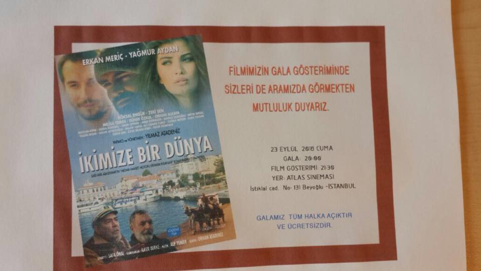 Yönetmenliğini ve Yapımcılığını Yılmaz Atadeniz’in üstlendiği, senaryosunu ise Safa Önal‘ın Sait Faik Abasıyanık‘ın Medar-ı Maişet Motoru Birtakım İnsanlar adlı eserinden esinlenerek senaryolaştırdığı “İkimize Bir Dünya” filminin galası, 23 Eylül‘de cuma günü saat 20:00‘de Beyoğlu Atlas Pasajında bulunan Atlas Sineması‘nda yapılacak. Film gösterimi Gala’dan hemen sonra saat 21:30‘de başlayacak. Filmin galası herkese açık olarak gerçekleştirilecek.