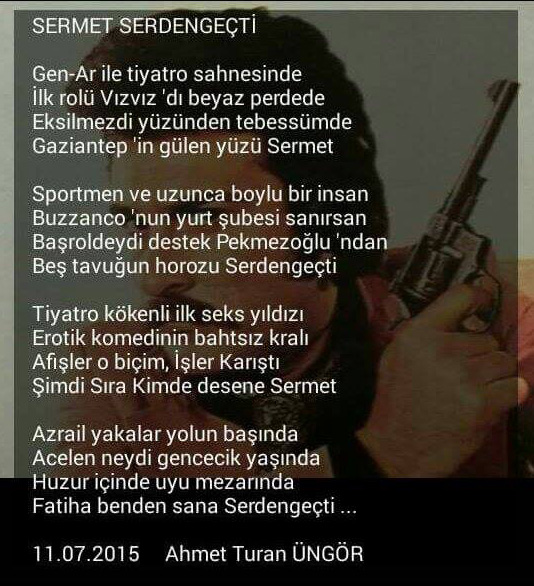 Sosyal Medya üzerinde farklı paylaşımları ve yazdığı şiirler sonucunda kendisine sitemizde yer vermek istedik. 25 Aralık 1976 tarihinde bir trafik kazası sonucunda 32 yaşında aramızdan ayrılan Sermet Serdengeçti için yazdığı şiirlere yer vermek istedik.