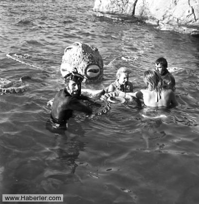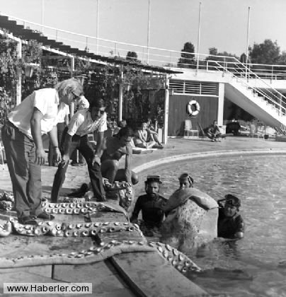 Sağ tarafta Ahtapotun Efes Oteli havuzuna indirilmesi ve sol fotoğrafta ise su altındaki kavgadan bir sahne yer almaktadır.