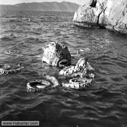 İşte yukarıdaki ve aşağıdaki fotoğraflarda Bodrum kalesinin önüne indirilen ahtapotu, kurbanların bağlandığı ahşap adak salını, film ekibini ve dalgıçları görmekteyiz.