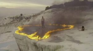 Born of Fire boyunca kullanılan metaforlar, seyirciye adeta görsel bir ziyafet, fantastik bir atmosfer sunuyor. Açılış sahnesinde Hıristiyan inancındaki kıyamet alametlerinden biri sayılan güneş tutulmasının sürreal görselliyle paralel gösterilen yanardağların patlaması, Nemrut Dağı’nda Mevlevi dervişlerin sema ayininde görüldüğü, Pamukkale travertenlerinden kanların aktığı, dervişlerin taş yerine sarı çiçeklerle kadın taşladığı unutulmaz sahneleri ile hafızalara kazınmayı hak eden, sanat yönetimi oldukça başarılı bir yapım.