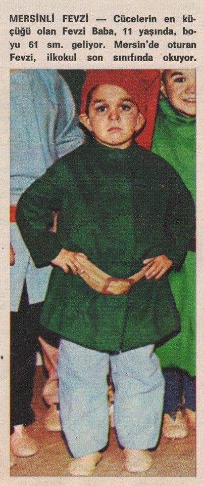 “MERSİNLİ FEVZİ – Cücelerin en küçüğü olan Fevzi Baba, 11 yaşında, boyu 61 sm. geliyor. Mersin’de oturan Fevzi, İlkokul son sınıfta okuyor.” (seçmelerde seçilmiş ama Çekilen filmde onun yerine “Aksırık” karekterini Aydın Babaoğlu‘nun kardeşi, Ayhan Babaoğlu oynamış)