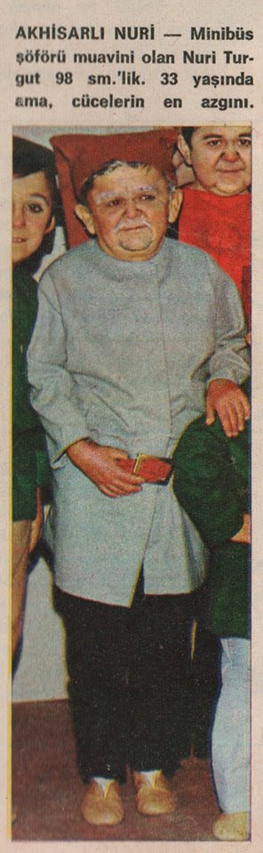 “AKHİSARLI NURİ – Minibüs şöförü muavini olan Nuri Turgut 98 sm.’lik, 33 yaşında ama cücelerin en azgını.”