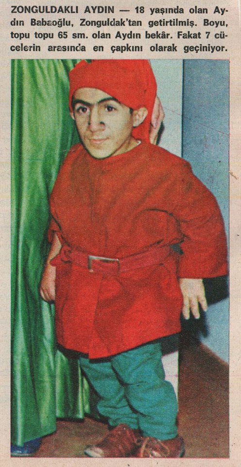 “ZONGULDAKLI AYDIN – 18 yaşında olan Aydın Babaoğlu, Zonguldak’tan getirtilmiş. Boyu, topu topu 65 sm. olan Aydın bekar. Fakat 7 cücelerin arasında en çapkını olarak geçiniyor.