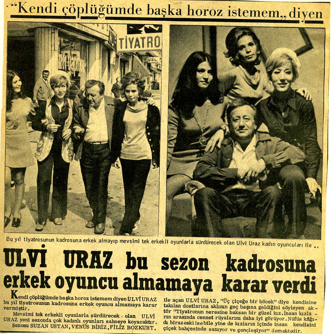 Kışın bir Anadolu turnesine çıktık, kış turnesi müthiştir. Eksi 15, eksi 20 derecelerde. Şöyle sıcacık bir örnek vereyim: Otobüsle seyahat ediyoruz. Siz bilmezsiniz, gazla çalışan, bacası olmayan, yuvarlak Alaaddin sobaları vardı. Gazı kendi içinde bitirirdi, duman da çıkmazdı. Otobüsün kaloriferi yetmediği için, o Alaaddin sobalarından biri benim kucağımda, biri Metin’in kucağında. Birimiz otobüsün orta yerinde, diğerimiz öbür tarafında oturuyoruz, otobüsü ısıtıyoruz. Ama soba hep kucağımızda çünkü yere konamıyor. Arada sobayı ön cama tutuyoruz, buzlanmasın diye. Öyle bir turne yaptık efendim. Önce borcumuzu ödedik. Ve dedik ki “biz kendi tiyatromuzu kurana kadar hiçbir iş yapmayacağız.” Bunu söylemek, böyle kahramanlık taslamak kolay fakat para çok çabuk bitiyor! Hadi ben bekârdım, annemle oturuyordum, onun yaptığı yemekleri yiyordum, yatacağım yere para vermiyordum ama Metin, beş senelik filan evliydi o zaman. Para yok pul yok. Bir süre, inanmayacaksınız, tahta kaşıkları oyup, üzerlerine figürler çizip -çok iyi çizim yaparım ben- turistik eşya satan dükkânlara satarak geçindim. Halaskârgazi’de, çok merkezî bir yerdeydi dükkân, her geçtiğimizde bakardık, vitrinde duruyor olurdu bizim kaşıklar. Bir gün yine oradan geçiyoruz, kaşık yok, satılmış! İçeri girdik Metin’le beraber, bir baktık, içerideki vitrinde duruyor. Hakikaten çok üzücü bir vaka, açız yahu! En sonunda yapacak bir şey kalmayınca bir tiyatronun teklifini kabul ettik. Açlık çok fena terbiye ediyor insanı. Bir gün bunu tartışırak İstiklal Caddesi’nde yürüyoruz Tünel’e doğru, Haldun Taner geliyor karşıdan. Çok önemli bir entelektüel, önemli bir tiyatro yazarı ama tabii öncelikle ünlü bir hikâye yazarı. Bana göre Türkiye’nin gelmiş geçmiş en büyük tiyatro yazarlarından biri. “N’apıyorsunuz?” dedi. Daha evvel ‘Gözlerimi Kaparım, Vazifemi Yaparım’ adlı oyununu izlemiştik biz Metin’le. Ben de size anlattığım gibi anlattım, bize “kabare tiyatrosu yapmak istiyorum, var mısınız?” dedi. Tabii büyük bir heyecanla kabul ettik ama hemen arkasından dedim, kabare tiyatrosu ne? Yani tiyatronun belli biçimlerini biliyoruz ama kabareyi bilmiyoruz. Biliyorsak bile yapacak kadar bilmiyoruz. Hemen orada bir kafeye oturduk, bize ayaküstü anlattı. 1967 senesinin 1 Eylül’ünde Devekuşu Kabare denen macera başladı.