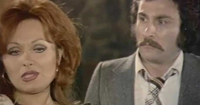 Hakan Ural ile Harika Avcı… Alışırım’dan bir kare. Hakan Ural, Harika Avcı, Ünsal Emre, Coşkun Göğen ve Erdal Tosunlu ilginç bir kadrosu olan film…