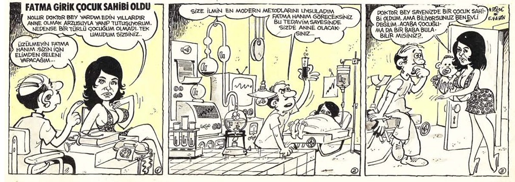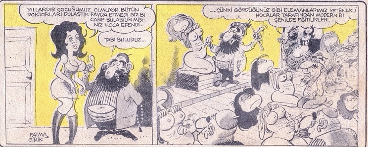 Dönemin mizah dergilerinde, güzelliği, ince ruhu, eşsiz mavi gözleri ve “Sansür’e Karşı Ankara Yürüyüşü”yle öne çıkarılan Fatma Girik çizgileri…